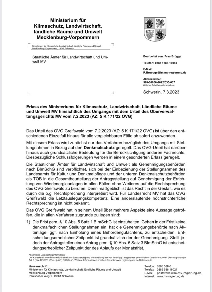 10.03.2023 . Erlass des Ministeriums für Klimaschutz, Landwirtschaft, Ländliche Räume und Umwelt MV hinsichtlich des Umgangs mit dem Urteil des Oberverwal- tungsgerichts MV vom 7.2.2023 (AZ: 5 K 171/22 OVG Darin heißt ... Mehr