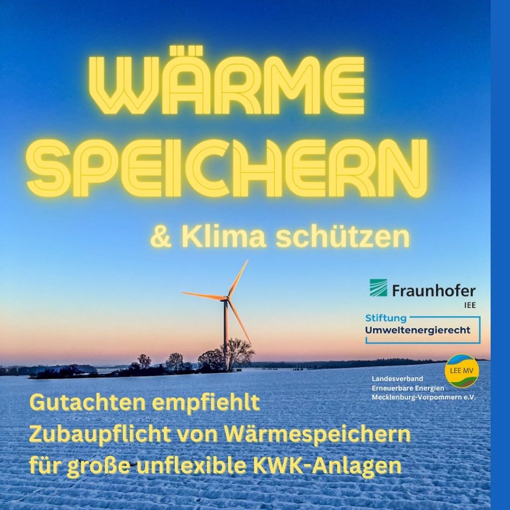 22.12.2022 . Unsere Themen: Forschungsprojekt zum Klimaschutz: Verschiebung der Stromproduktion schafft Platz für Windenergie im Netz - Der Landesverband Erneuerbare Energien Mecklenburg-Vorpommern (LEE MV) hat im Rahmen des öffentlich geförderten Vorhabens „Klimaschutz durch Wärmewende und Sektorenkopplung“ untersuchen lassen, wie Wärmespeicher mehr Flexibilität ins Gesamtsystem bringen können. Die beauftragten Wissenschaftler des Fraunhofer-Instituts für Energiewirtschaft und Energiesystemtechnik (Fraunhofer IEE) und der Stiftung Umweltenergierecht sind zu den Ergebnissen gekommen, dass zusätzliche Wärmespeicher wirtschaftlich betrieben werden können und eine Verpflichtung im Sinne des Klimaschutzes verfassungsrechtlich möglich ist. Stellungnahme des LEE MV im Rahmen der Verbandsanhörung zum Erlass zur Festlegung landesweit einheitlicher, verbindlicher Kriterien für Windenergiegebiet an Land Termine für mehr Klimaschutz Podcasts für mehr Klimaschutz Film von MV1 für mehr Klimaschutz Humor für mehr Klimaschutz