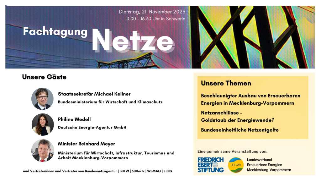 FES MV und LEE MV . Netzanschlüsse – Goldstaub der Energiewende? Bereits zum 4. Mal richten wir in Kooperation mit der Friedrich-Ebert-Stiftung unsere traditionelle Herbsttagung aus, um mit entscheidenden Akteurinnen und Akteuren aus Politik, Verbänden und ... Mehr